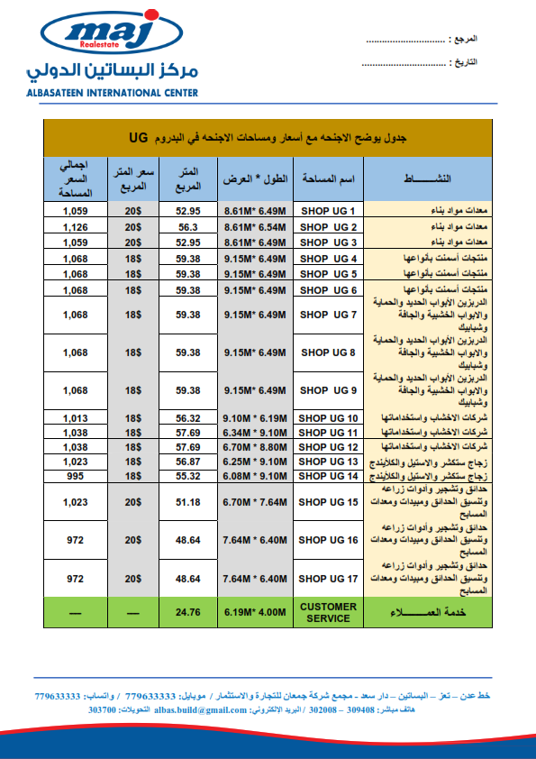 وصف مختصر للقسم: يوضح الجدول (كمرفق/صورة) مسميات الأجنحة والمساحات (م²) والأبعاد وسعر المتر وإجمالي السعر، مع الأنشطة المقترحة لكل مساحة، لتسهيل اختيار الموقع المناسب لنشاطك.